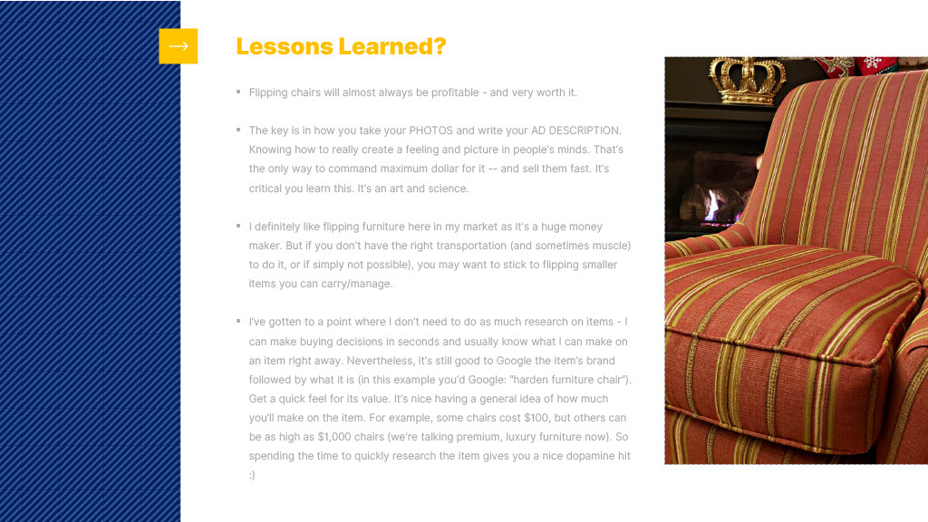 • Comprehensive Training Program: A complete flipping course teaching people how to source, negotiate, and sell items for profit — helping thousands make $1,000–$5,000/month part-time.